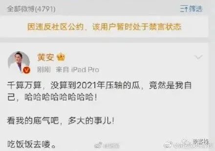 今年娱乐圈不太平,大大小小的瓜一个接一个,本以为快到年底了,吃完上一个大瓜后总该消停了。没想到,22日,知名歌手黄安在微博爆料称:“我的朋友,香港资深娱乐记者,猪头皮(朱叔)爆料,章子怡、汪峰已经离婚了!“一石激起千层浪,这条“离婚消息”瞬间在网络传的沸沸扬扬,当日深夜,章子怡发文怒怼:假的!并喊话汪峰,“该告谁告谁!”随后,黄安将涉事微博删除,并于23日凌晨发出视频向章子怡、汪峰道歉。昨晚(12月24日)#歌手黄安被禁言#的话题冲上热搜第二。目前,黄安的微博状态显示,该用户因违反社区公约处于禁言状态。黄安在被禁言前还发了一条微博,称“千算万算,没算到2021年压轴的瓜竟然是我自己”。并颇为轻松地表示“看我的底气吧,多大的事儿”。黄安,1962年12月8日出生于中国台湾省新竹县竹北市,祖籍福建泉州,中国台湾男歌手、主持人、演员。1989年7月,发行个人首张专辑《一切从头》。1993年,发行专辑《新鸳鸯蝴蝶梦》,在中国台湾地区超过100万张,全球超过600万张。而黄安所提及的朱叔是香港娱乐记者,有三十多年从业经验,在抖音也开设了账号,并将和吴孟达、元彪的互动、聚餐等置顶宣传。靠着爆料名人,朱叔积累了580多万粉丝,在网上的影响力不低。汪峰、章子怡事件发酵后,朱叔580万粉的大号,虽然已经无法在抖音上搜到,但账号却并未封禁,已经关注原账号的人,仍然可以进入其首页观看视频,目前,朱叔仍未对此事做出回应。