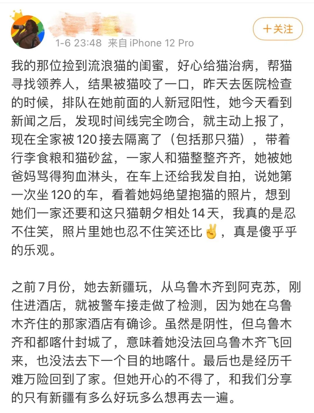 好心收养了一只流浪猫,却不小心被它咬了一口,是不是足够倒霉了?没想到立刻赶往医院检查,却发现排队在她面前的人新冠阳性,一家人带着猫又整整齐齐地坐上了120开始了隔离之旅。这样匪夷所思的倒霉事却真实的发生了。昨日,微博上一位网友分享了她好友的近期经历。![]()