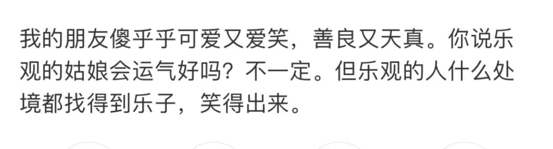 这是一种令旁人羡慕的能力,在困难和烦心时,乐观带给人继续前进的勇气和心情,虽然有时在旁人眼里,这种“乐观”的心情中带着一丝“傻乎乎”的气息,但是笑对生活,偶尔迷糊开心,不也是一种方式吗?乐观的人一定幸运吗?不,乐观的人一定能找到乐子,笑得出来。