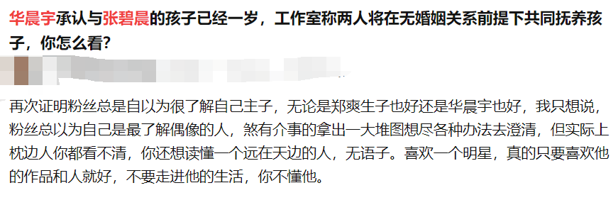 “我昨天贴吧看到有人爆料华晨宇和张碧晨生娃,一群粉丝在下面骂张碧晨倒贴女不可能,结果今天就打脸了,又吹华晨宇有担当,笑死我了。”