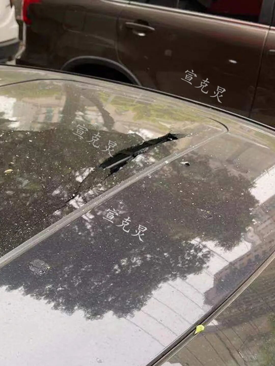 记者看到:车主王先生的售价约200万元的路虎车车顶天窗被砸坏,王先生说:他原本不知道这一情况,是保安通知他后才知道自己的车被砸了,原本全家人打算第二天开车出去扫墓,这些就很心烦了。
