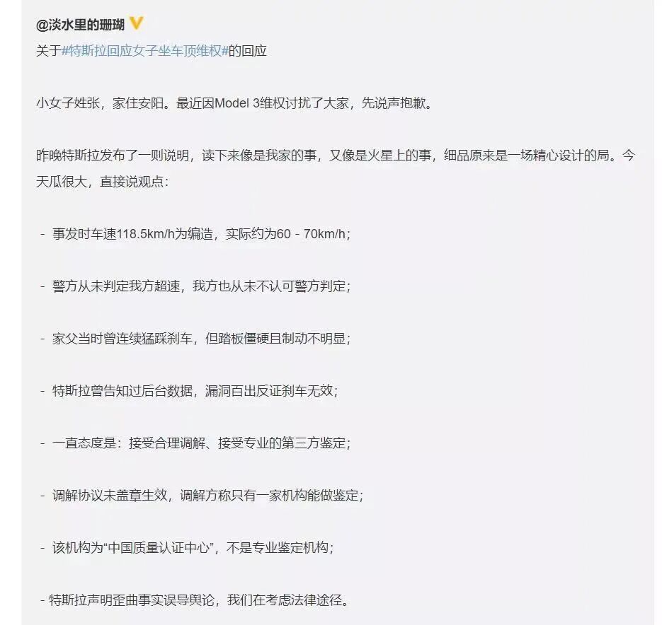 小女子姓张,家住安阳。最近因Model 3维权讨扰了大家,先说声抱歉。昨晚特斯拉发布了一则说明,读下来像是我家的事,又像是火星上的事,细品原来是一场精心设计的局。今天瓜很大,直接说观点:事发时车速118.5km/h为编造,实际约为60-70km/h;警方从未判定我方超速,我方也从未不认可警方判定;家父当时曾连续猛踩刹车,但踏板僵硬且制动不明显。 特斯拉曾告知过后台数据,漏洞百出反证刹车无效;一直态度是:接受合理调解、接受专业的第三方鉴定;调解协议未盖章生效,调解方称只有一家机构能做鉴定;该机构为“中国质量认证中心”,不是专业鉴定机构;特斯拉声明歪曲事实误导舆论,我们在考虑法律途径。而网友对此也展开了讨论,大部分网友都保持冷静,理智地给出了提议:建议女车主保留好证据,用行车记录仪、事故地点监控来证明,事实胜于雄辩;也有网友表示,应当找一个权威且双方都认可的第三方机构来进行检测。
