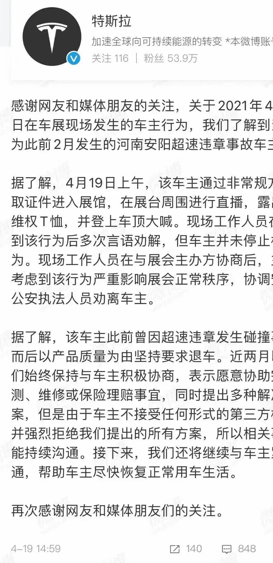 感谢网友和媒体朋友的关注,关于2021年4月19日在车展现场发生的车主行为,我们了解到当事人为此前2月发生的河南安阳超速违章事故车主。据了解,4月19日上午,该车主通过非常规方式获取证件进入展馆,在展台周围进行直播,露出定制维权T恤,并登上车顶大喊。现场工作人员在注意到该行为后多次言语劝解,但车主并未停止相关行为。现场工作人员在与展会主办方协商后,主办方考虑到该行为严重影响展会正常秩序,协调安保及公安执法人员劝离车主。据了解,该车主此前曾因超速违章发生碰撞事故,而后以产品质量为由坚持要求退车。近两月以来我们始终保持与车主积极协商,表示愿意协助完成检测、维修或保险理赔事宜,同时提出多种解决方案,但是由于车主不接受任何形式的第三方检测,并强烈拒绝我们提出的所有方案,所以相关事宜只能持续沟通。接下来,我们还将继续与车主紧密沟通,帮助车主尽快恢复正常用车生活。![]()
