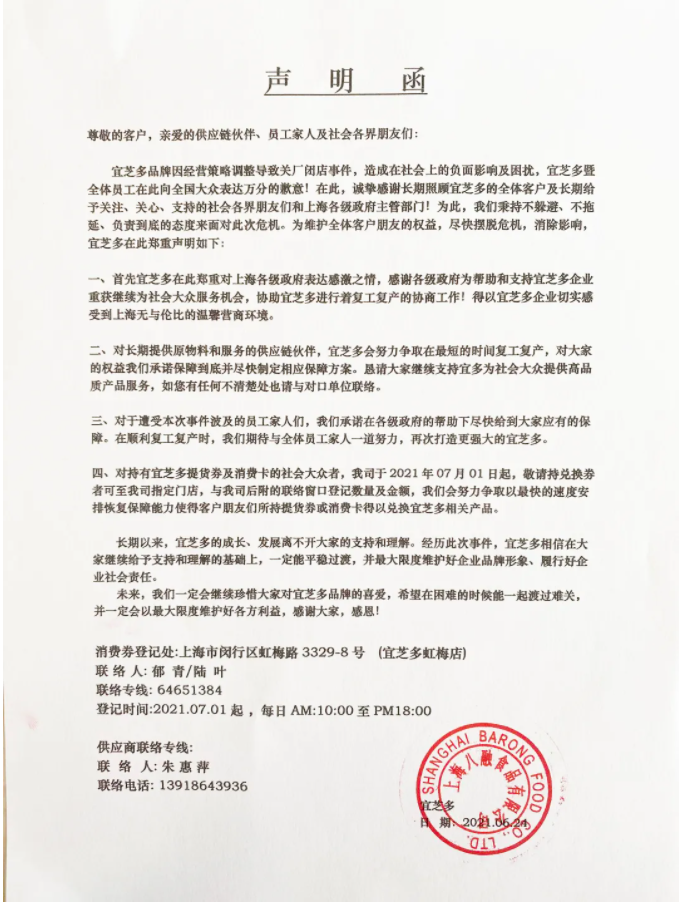 四、对持有宜芝多提货券及消费卡的社会大众者,我司于2021年07月01日起,敬请持兑换券者可至我司指定门店,与我司后附的联络窗口登记数量及金额,我们会努力争取以最快的速度安排恢复保障能力使得客户朋友们所持提货券或消费卡得以兑换宜芝多相关产品。消费券登记处:上海市闵行区虹梅路3329-8号(宜芝多虹梅店)