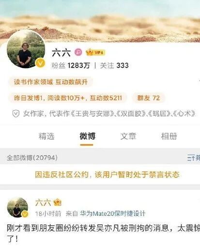 此外,8月1日晚,曾力挺吴亦凡的@马薇薇 、@六六、@苏芒等人微博账号均显示“因违反社区公约,该用户暂时处于禁言状态”。