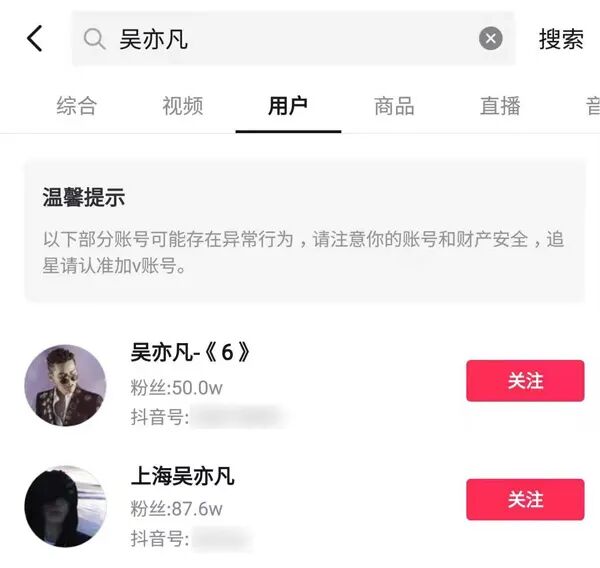 不仅仅是微博,有关于吴亦凡的其它短视频社交账号也被封,目前所有粉丝清零。在抖音平台搜索“吴亦凡”后,显示“温馨提示:以下部分账号可能存在异常行为,请注意你的账号和财产安全,追星请认准加v账号”。