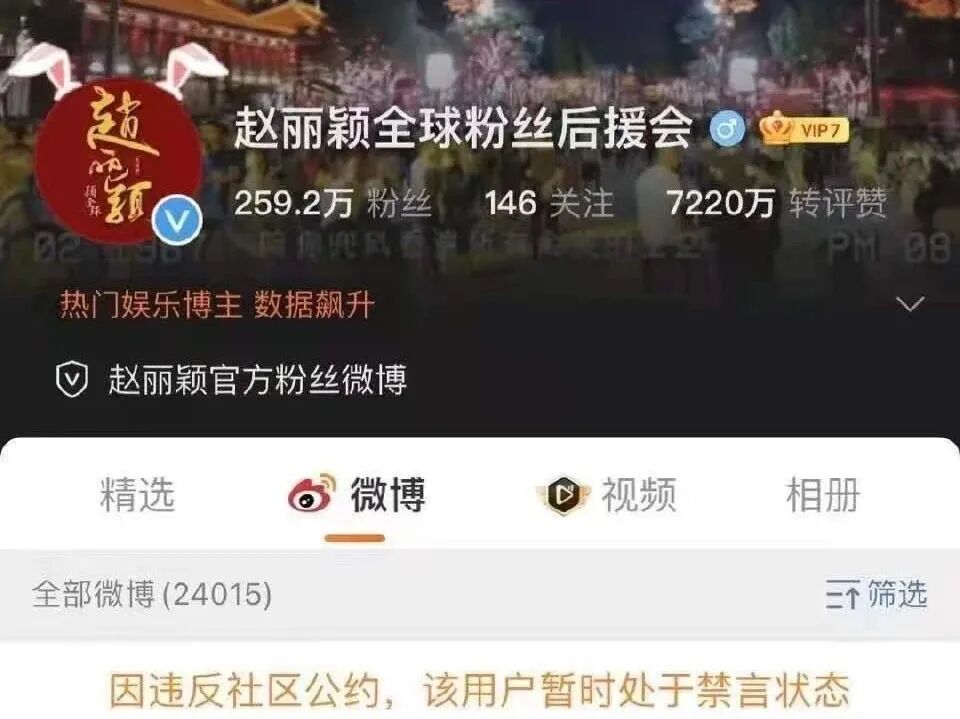 8月23日下午,赵丽颖粉丝群的多个官方微博或大V遭微博禁言,其中包括有259万粉丝的“赵丽颖全球粉丝后援会”,234万粉丝的“赵丽颖微吧”,拥有200万粉丝的赵丽颖超话粉丝大咖“胖颖飞刀”,拥有70.8万粉丝的“赵丽颖吧官博”等。