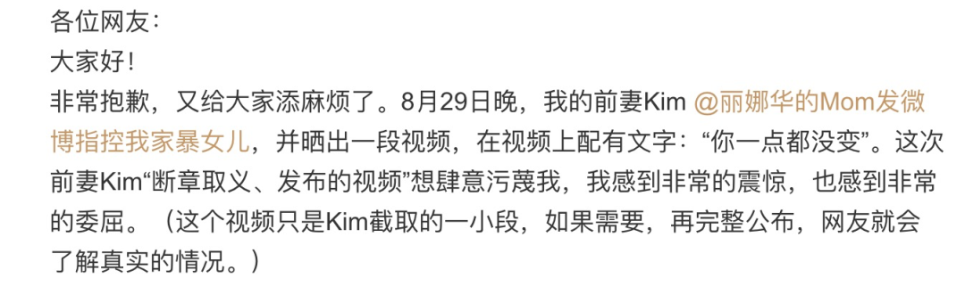 他表示:这次是前妻Kim断章取义、发布的视频,并想肆意污蔑。对此,感到非常的震惊,也感到非常的委屈。