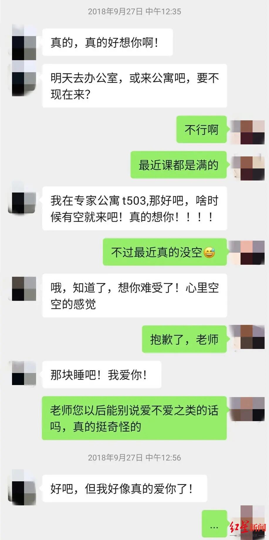 根据网友小格(化名)发布的文章内容,她已于2021年本科毕业。2018年9月26日,小格18岁正读大二,因在马克思主义基本原理课堂上,得知教授乌峰将要去意大利出差,而自己正在寻找一个意大利诗人的书籍,便在课后主动加乌峰微信,希望他出差时能帮忙带诗人的书籍。聊天截图显示,两人加微信半小时后,微信名“乌峰”发来一句“你不是喜欢我了吧!哈哈哈!”并称自己爱开玩笑。小格希望对方能推荐哲学入门书籍给她,“乌峰”则将自己办公室位置发给她,让她到办公室找他。小格发布的多张微信聊天截图和文字显示,“乌峰”多次发消息说“我爱你”“想亲嘴”“想你”之类的话,还让小格去他办公室或公寓,小格感到很恐慌,多以“有课”“没空”之类的理由婉拒。![]()