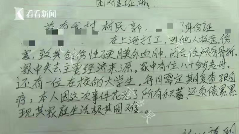 小酌怡情,但有些人总是把自己灌得酩酊大醉结果惹出祸事。今年7月,来沪男子李某某在豪饮2箱24瓶650毫升啤酒后,迷迷糊糊间竟把隔壁床上的郭某某误当作了尿壶,双方一番口角后,更是用啤酒瓶猛向后者头上砸去,造成对方重伤。犯罪嫌疑人李某某与被害人郭某某是租住在浦东上南路旁一间集装箱内的室友。这间集装箱被一名劳务中介租下,隔成东西两间房间,并以每人每月300元的费用收取租金。两人租住的房间内有三张下上铺,事发时租住有5名人员。7月11日凌晨,李某某喝完酒后往熟睡中的郭某某头上和床铺上撒尿,双方发生口角后李某某用早先存放的空啤酒瓶多次敲打郭某某。随后,李某某清醒过来,立即陪同郭某某前往第九人民医院就诊。浦东新区人民检察院柳检察官助理向记者表示:“李某某和郭某某是同住一个宿舍的工友。”“2021年7月11日凌晨两点的时候,郭某某已经睡着了,犯罪嫌疑人李某某已经喝醉了酒夜里起来撒尿,尿在被害人头上以及床铺上,被害人惊醒之后起床拿着被子跟犯罪嫌疑人理论,引发口角,后来被犯罪嫌疑人拿着玻璃瓶往身上砸,先后拿了五六个啤酒瓶砸上去,把被害人砸成头部积血构成重伤二级,右眼眶顶部粉碎性骨折构成轻伤二级。”“犯罪嫌疑人没有赔偿能力,然后被害人在住院期间从2021年7月11日住院到2021年8月6日出院,先后用了16万1千人民币,后续还需要颅骨修复性手术,但是家里也没钱。”经鉴定,其伤势构成重伤二级,在医院救治过程中先后花去医疗费十余万。前期治疗之后,郭某某回到外地老家休养。不过,郭某某恢复情况不甚理想,目前其右手几乎没有任何力气,尚需八至十万进行第二次修复手术。被害人郭某某女儿通过远程连线的方式告诉记者:“我父亲现在脑壳颅骨下边都是空的,现在他手上根本没有行动能力,他的右手也没有力气。我们想给他第二次手术,没有足够的手术费。”“他的身体右侧不行,你看他现在精神状态那么差。现在这个手术费的话,我们主治医生说了,要八到十万。”目前,犯罪嫌疑人李某某已因涉嫌故意伤害罪被批准逮捕。据悉,李某某曾于2011年因被黄浦公安处以行政拘留三天的处罚。犯罪嫌疑人家属至今分文未赔,郭某某一家因此陷入困境。在办案过程中,浦东新区人民检察院检察官了解到郭某某的家庭情况。他的母亲年迈,儿子尚在读大学,妻子患有胃病,家中收入原先主要靠郭某某在上海打工赚钱支撑。但其这次受伤不仅断了经济来源,还用光家中积蓄,后期治疗难以为继。被害人郭某某女儿告诉记者:“我妈妈是家庭主妇,根本没有收入。以前我爸爸是家里顶梁柱。现在我还有一个八十多岁的奶奶,还有个上大学的弟弟。现在家里的经济来源就是我妈在做清洁工,路边打扫卫生的,一天四五十块钱、五六十块钱。”检察官告知其可以依法申请国家司法救助的权利。检察官表示:被害人因刑事案件受到的损失无法通过诉讼途径获得,司法机关有义务通知其有权利申请司法救助。柳检察官助理向社会公众解释何为司法救助政策:“如果一个人因为刑事案件损失很大,犯罪嫌疑人没有赔偿能力,也无法通过诉讼途径获得有效赔偿,我们司法机关就有义务通知被害人有权利申请司法救助。被害人郭某某正好符合我们的条件,我们就通知他了,他也向我们申请了。”为了避免申请人的来回奔波,检察官提出让其家人通过邮寄的方式将相关材料寄到上海。在收到材料之后,检察官立即对其家庭情况、受损程度开展核查工作,核查后认为其符合国家司法救助的条件,并于10月27日通过远程视频的方式告知对其发放国家司法救助金的决定。柳检察官助理表示:“我们知道这个情况后赶紧联系被害人,被害人家属向我们提出司法救助申请,我们经过研究,决定给与被害人司法救助人民币三万元。”【悲剧!4死1伤家破人亡】沪修车铺店主违规充电起火 !杂物倒下挡住妻子逃生路 ...