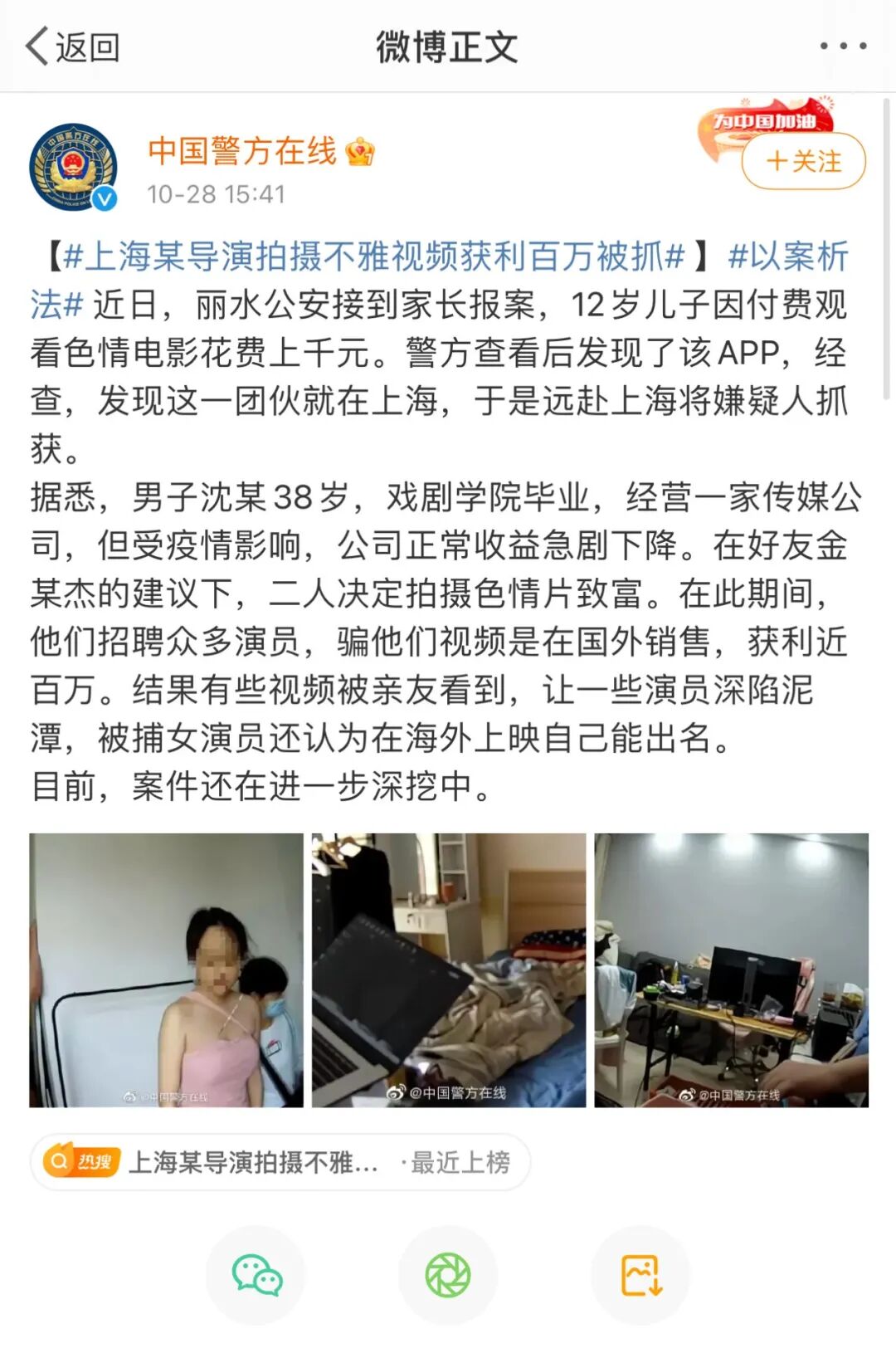 10月28日,#某导演拍摄不雅视频获利百万被抓,这一话题冲上了微博热搜榜首。
