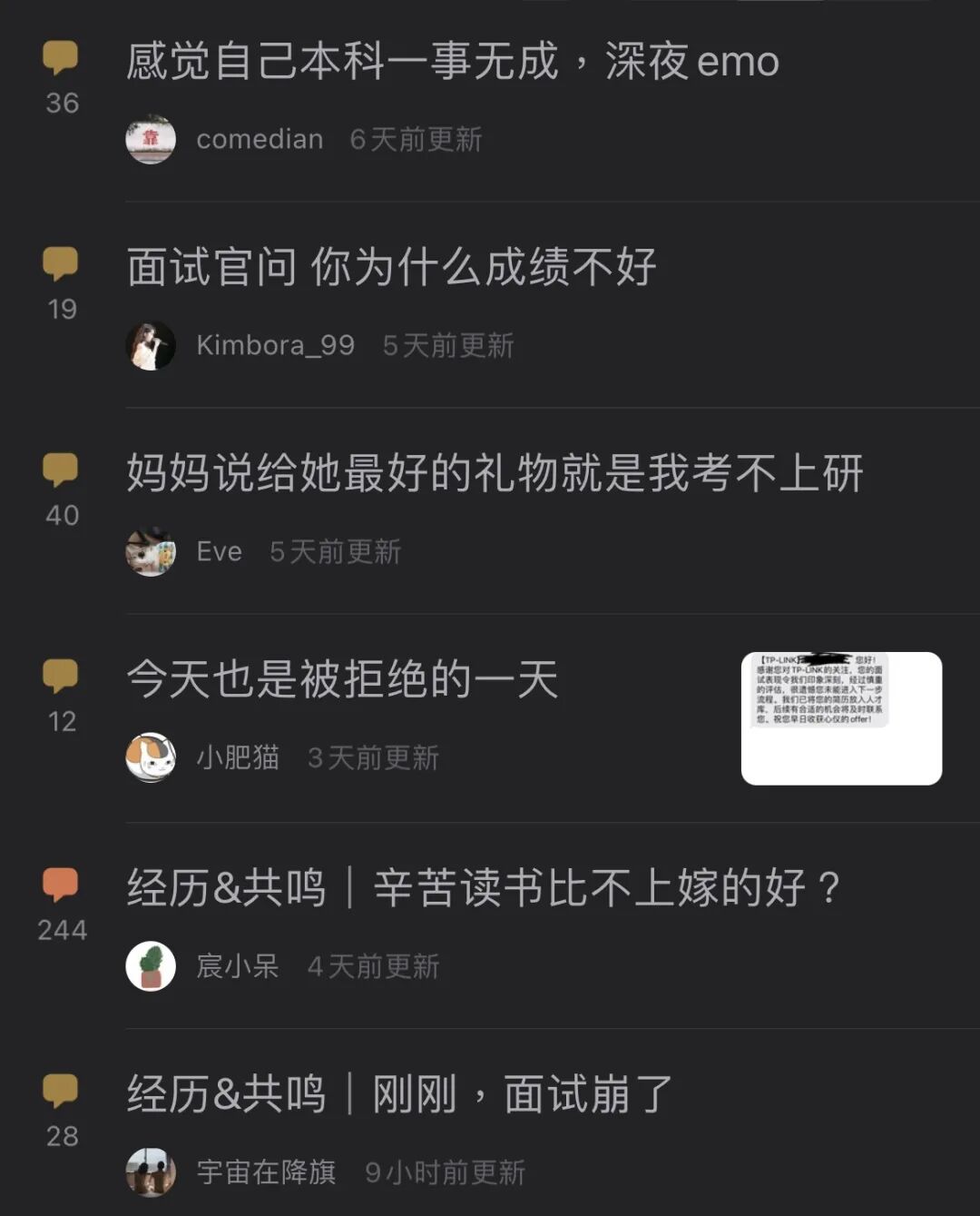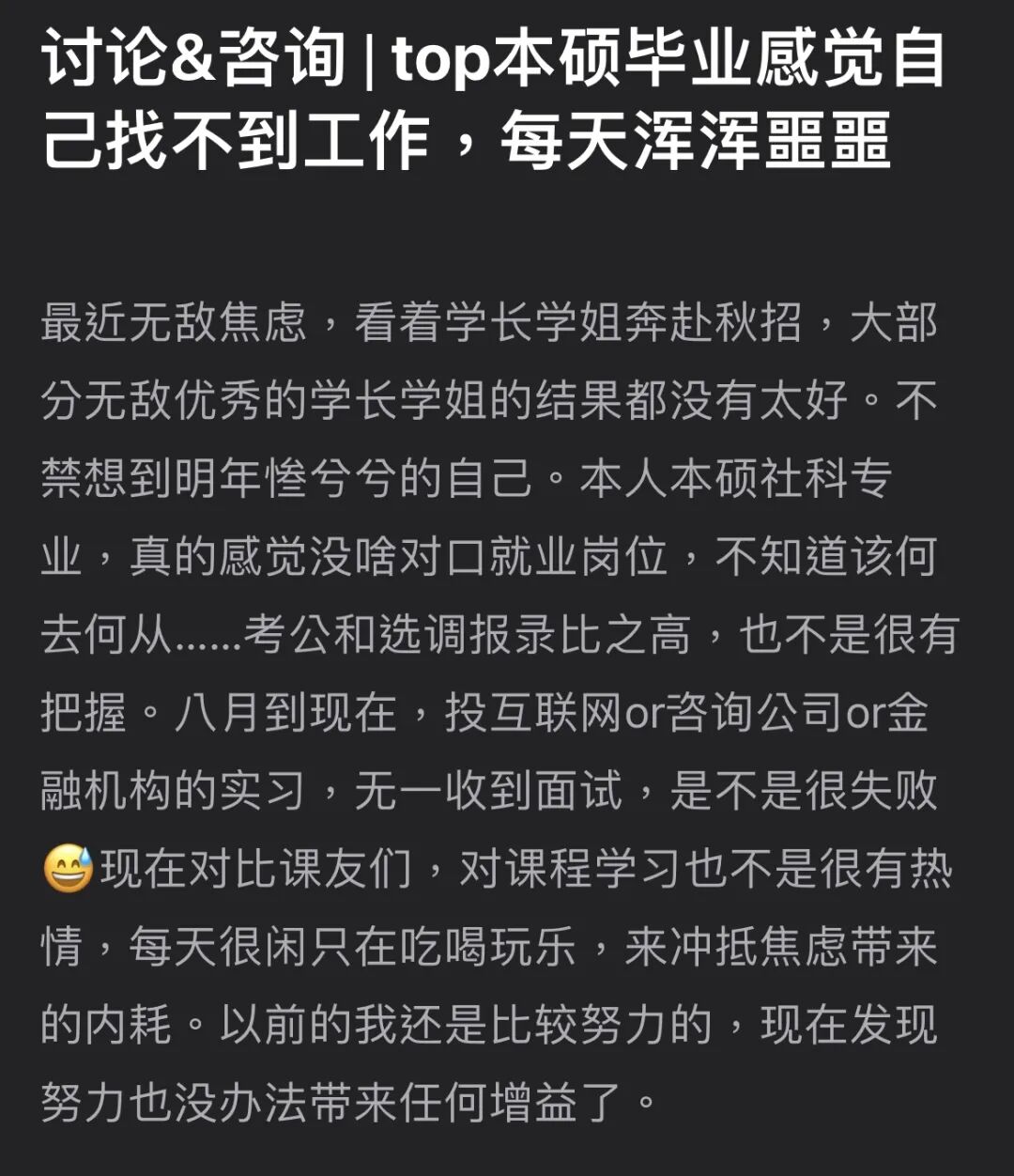 而经过几轮社会毒打,他们也从刚刚保上研时“年薪百万”的壮志,变成了“有个工作”就好的自嘲。