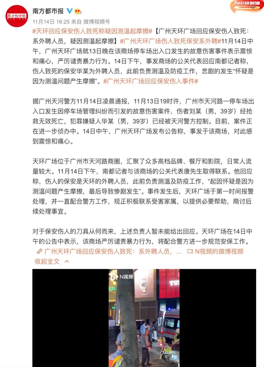 公告称,该故意伤害事件因停车纠纷而引发,商场对此感到震惊和痛心,对遇害者家属表示最诚挚的问候,并将尽快与之协商提供帮助及后续事宜的处理。天环广场表示,商场严厉谴责暴力行为,将配合警方进一步规范安保工作。据南方都市报报道:昨天(11月14日)下午,事发商场的公关代表回应南都记者称,伤人致死的保安华某为外聘人员,此前负责测温及防疫工作,悲剧的发生“怀疑是因为测温问题产生摩擦”。 天环广场位于广州市天河路商圈,汇聚了众多高档品牌、餐厅和影院,日常人流量较大。 11月14日下午,南都记者与该商场的公关代表唐先生取得联系。他回应称,伤人的保安是天环的外聘人员,此前负责测温及防疫工作,“起因怀疑是因为测温问题产生摩擦,最后导致惨剧发生”。事件发生后,天环广场于第一时间报警处理,并一直配合警方工作,现正积极联系受害家属,以提供必要帮助,商讨后续处理事宜。 对于保安伤人的刀具从何而来,上述负责人暂未能给出回应。天环广场在14日中午的公告中表示,该商场严厉谴责暴力行为,将配合警方进一步规范安保工作。