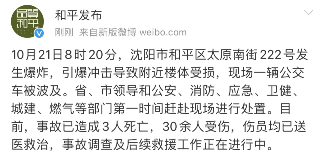 2021年10月21日,沈阳市和平区太原南街222号盛王二牛烧烤店,发生管道燃气泄漏爆炸事故,造成5人死亡、3人重伤、49人轻伤,直接经济损失约4425万元。沈阳市和平区太原南街222号“10·21”较大管道燃气泄漏爆炸事故是一起较大生产安全责任事故。