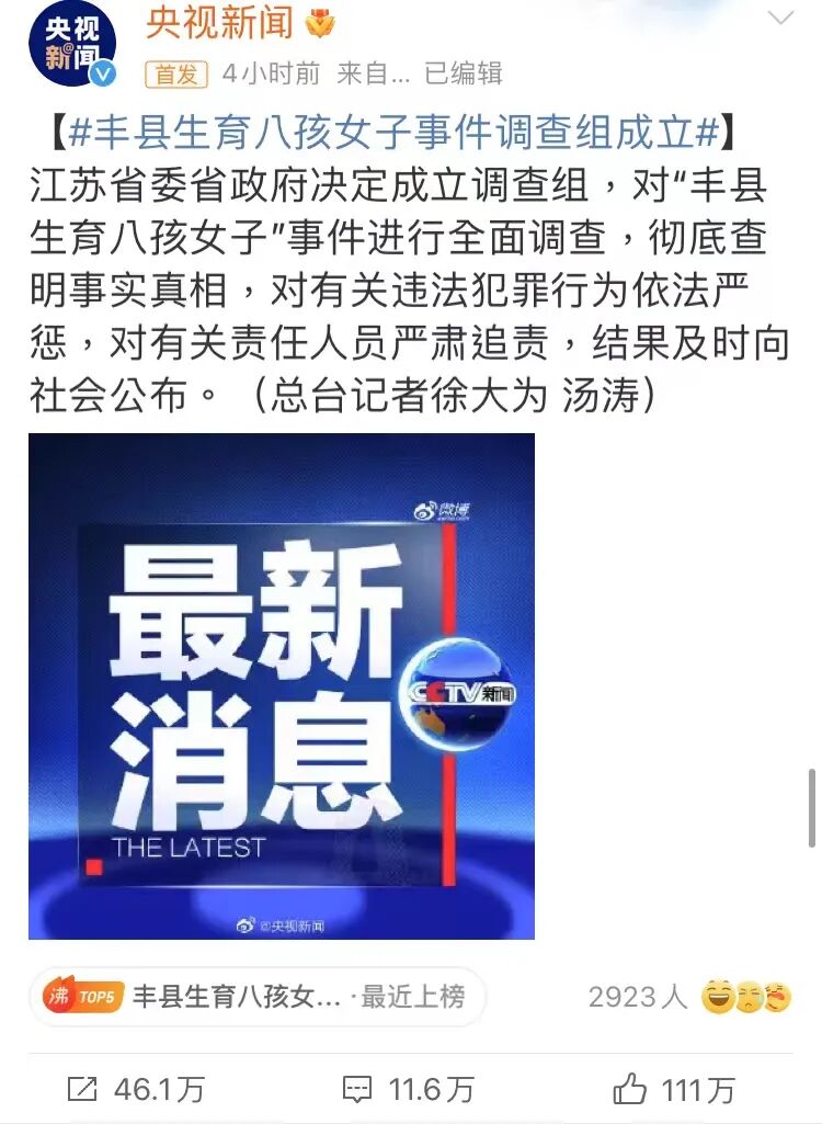 央视新闻官方微博在今天(2月17日)发文称:“江苏省委省政府决定成立调查组,对“丰县生育八孩女子”事件进行全面调查,彻底查明事实真相,对有关违法犯罪行为依法严惩,对有关责任人员严肃追责,结果及时向社会公布。”