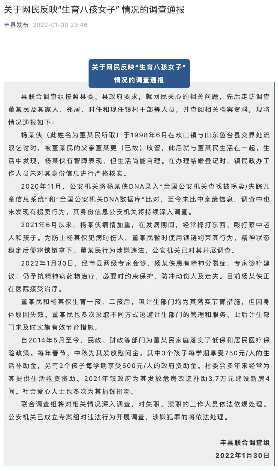 “县联合调查组按照县委、县政府要求,就网民关心的相关问题,先后走访调查董某民及其家人、邻居、时任和现任镇村干部等人员,并查阅相关档案资料,现将情况通报如下:杨某侠(此姓名为董某民所取)于1998年6月在欢口镇与山东鱼台县交界处流浪乞讨时,被董某民的父亲董某更(已故)收留,此后就与董某民生活在一起。生活中发现,杨某侠有智障表现,但生活尚能自理。在办理结婚登记时,镇民政办工作人员未对其身份信息进行严格核实。2020年11月,公安机关将杨某侠DNA录入“全国公安机关查找被拐卖/失踪儿童信息系统”和“全国公安机关DNA数据库”比对,至今未比中亲缘信息。调查中也未发现有拐卖行为。其身份信息公安机关将持续深入调查。2021年6月以来,杨某侠病情加重,在发病期间,经常摔打东西、殴打家中老人和孩子。为防止杨某侠犯病时伤人,董某民暂时使用锁链约束其行为,精神状态稳定后便将锁链拿下。董某民行为涉嫌违法,公安机关已对其开展调查。2022年1月30日,经市县两级专家会诊,杨某侠患有精神分裂症。专家诊疗建议:仍予抗精神病药物治疗,必要时约束保护,防冲动伤人及走失。目前杨某侠正在医院接受治疗。董某民和杨某侠生育一孩、二孩后,镇计生部门均为其落实节育措施,但因身体原因失效。董某民也多次采取不同方式逃避计生部门的管理和服务。此后计生部门未及时实施有效节育措施。自2014年5月至今,民政、财政等部门为董某民家庭落实了低保和居民医疗保险政策。每年春节、中秋为其发放慰问金。其中3个孩子每学期享受750元/人的生活补助金,另有2个孩子每学期享受500元/人的政府资助金。村委会多年来经常为其提供生活物资资助。2021年镇政府为其发放危房改造补助3.7万元建设新房4间。社会爱心人士也多次为其捐钱捐物。联合调查组将对相关情况深入调查,对失职、渎职的工作人员依法依规处理。公安机关已成立专案组对违法行为开展调查,涉嫌犯罪的将依法处理。”