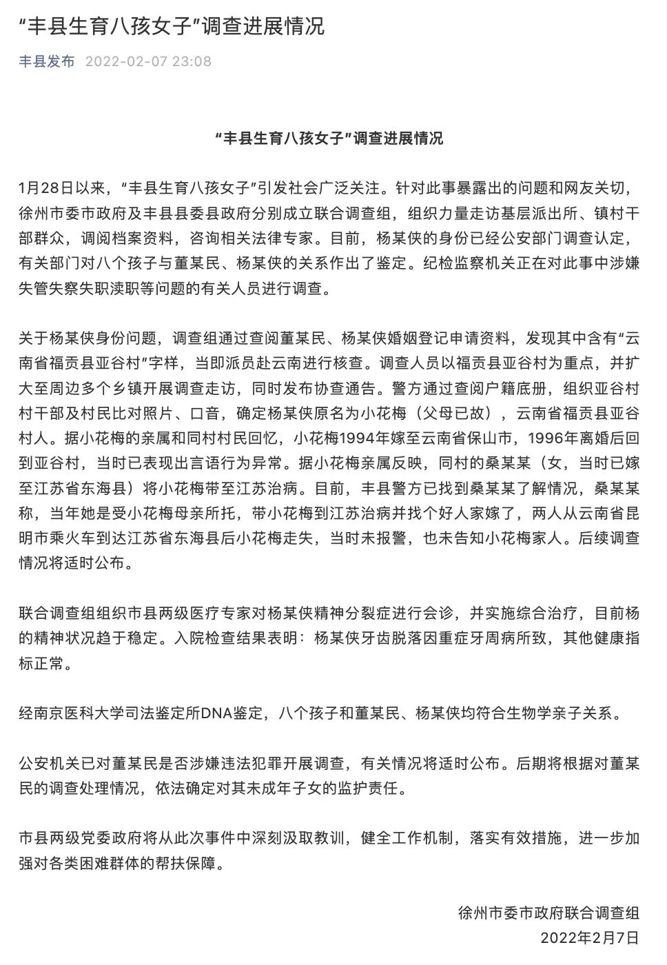 “1月28日以来,“丰县生育八孩女子”引发社会广泛关注。针对此事暴露出的问题和网友关切,徐州市委市政府及丰县县委县政府分别成立联合调查组,组织力量走访基层派出所、镇村干部群众,调阅档案资料,咨询相关法律专家。目前,杨某侠的身份已经公安部门调查认定,有关部门对八个孩子与董某民、杨某侠的关系作出了鉴定。纪检监察机关正在对此事中涉嫌失管失察失职渎职等问题的有关人员进行调查。关于杨某侠身份问题,调查组通过查阅董某民、杨某侠婚姻登记申请资料,发现其中含有“云南省福贡县亚谷村”字样,当即派员赴云南进行核查。调查人员以福贡县亚谷村为重点,并扩大至周边多个乡镇开展调查走访,同时发布协查通告。警方通过查阅户籍底册,组织亚谷村村干部及村民比对照片、口音,确定杨某侠原名为小花梅(父母已故),云南省福贡县亚谷村人。据小花梅的亲属和同村村民回忆,小花梅1994年嫁至云南省保山市,1996年离婚后回到亚谷村,当时已表现出言语行为异常。据小花梅亲属反映,同村的桑某某(女,当时已嫁至江苏省东海县)将小花梅带至江苏治病。目前,丰县警方已找到桑某某了解情况,桑某某称,当年她是受小花梅母亲所托,带小花梅到江苏治病并找个好人家嫁了,两人从云南省昆明市乘火车到达江苏省东海县后小花梅走失,当时未报警,也未告知小花梅家人。后续调查情况将适时公布。联合调查组组织市县两级医疗专家对杨某侠精神分裂症进行会诊,并实施综合治疗,目前杨的精神状况趋于稳定。入院检查结果表明:杨某侠牙齿脱落因重症牙周病所致,其他健康指标正常。经南京医科大学司法鉴定所DNA鉴定,八个孩子和董某民、杨某侠均符合生物学亲子关系。公安机关已对董某民是否涉嫌违法犯罪开展调查,有关情况将适时公布。后期将根据对董某民的调查处理情况,依法确定对其未成年子女的监护责任。市县两级党委政府将从此次事件中深刻汲取教训,健全工作机制,落实有效措施,进一步加强对各类困难群体的帮扶保障。”![]()