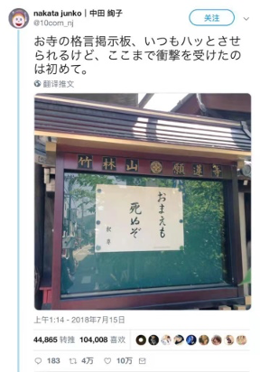 就在此前,在日本的社交平台上举办的“闪耀吧!寺庙布告栏大赏”活动中,以募集各大寺院的布告栏标语的方式,供广大的网友们一同共赏。其中在阜县郡上市愿莲寺布告栏上的标语“你也会死呀”在twitter被转发超过四万次,点赞超过10W+,成为了人人喜爱的标语。
