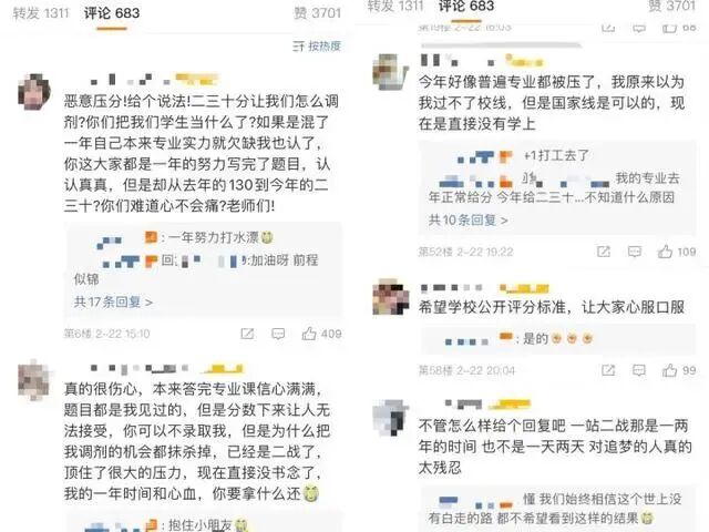 该考生将事情发到网上引发共鸣,不少考生表示上海师范大学有“恶意压分”现象,其中不乏一些“二战生”“三战生”。同一科目去年130+,今年仅得20分,考生质疑“压分”:在分数“被篡改”之外,还有一部分考生在网络反馈,质疑学校给出的分数不公平。