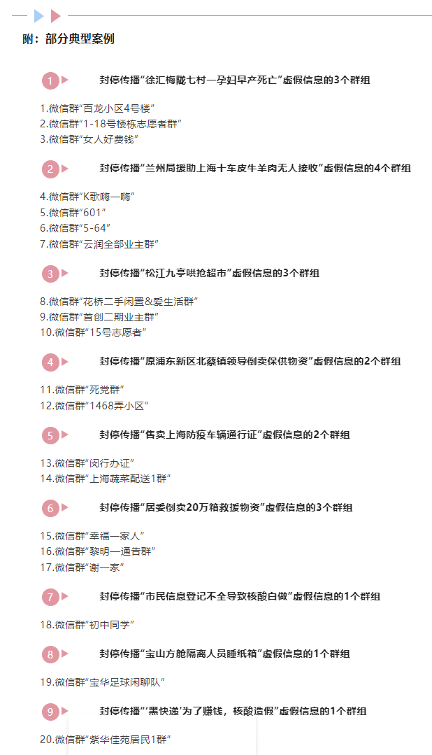上海网信办自4月8日发布《关于进一步查处网络圈群造谣行为的公告》以来,经与公安部门联合溯源调查,依据互联网相关法律法规,已协调相关部门对“百龙小区4号楼”“K歌嗨一嗨”“花桥二手闲置&爱生活群”“死党群”“闵行办证”等传播涉疫谣言的30个网络群组予以封停,对23名首发谣言的微信个人用户予以处罚。
