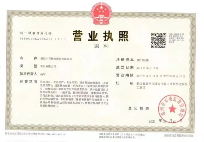 经杨浦区市场监管部门对实物和企业营业执照、食品生产许可证等相关资质的核查,主食包内“锐宝丰”鲜胚玉米油(非转基因)生产商浙江中可粮油股份有限公司具备食用油、油脂及其制品食品生产许可,注册资本1000万元。
