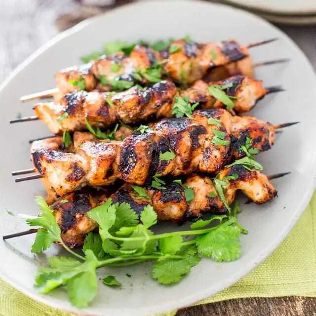 5 | Place chicken skewers on grill and turn every couple minutes or so, at the same time brushing some of the leftover marinades over the chicken, if preferred. Grill until chicken is cooked through. |