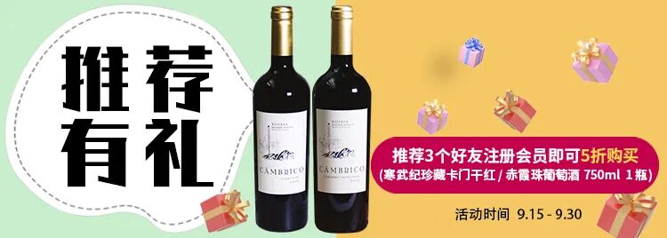 即日起至9月30号,每推荐成功3个会员,半价领取一瓶寒武纪珍藏卡门或寒武纪珍藏赤霞珠干红葡萄酒。