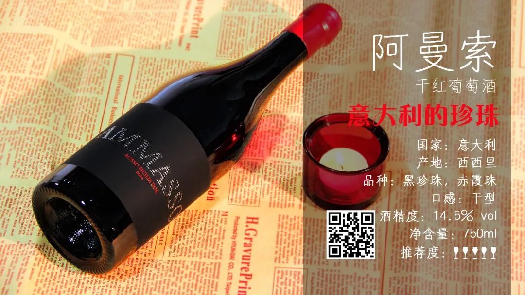 来自西西里的阿曼索干红葡萄酒,可谓深受小齐家顾客的欢迎。这款酒口感醇厚,果香浓郁,由黑珍珠,玛斯卡斯奈莱洛,梅洛和赤霞珠葡萄混酿而成。