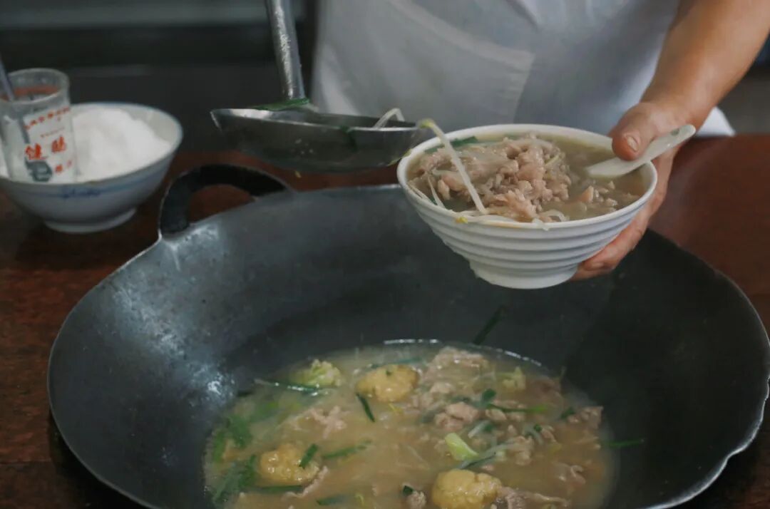 轻咬开扁食,葱香和肉香共同在口腔充盈开来,肉质扎实饱满,入口温软有韧劲,细腻滑溜,汤头清甜。