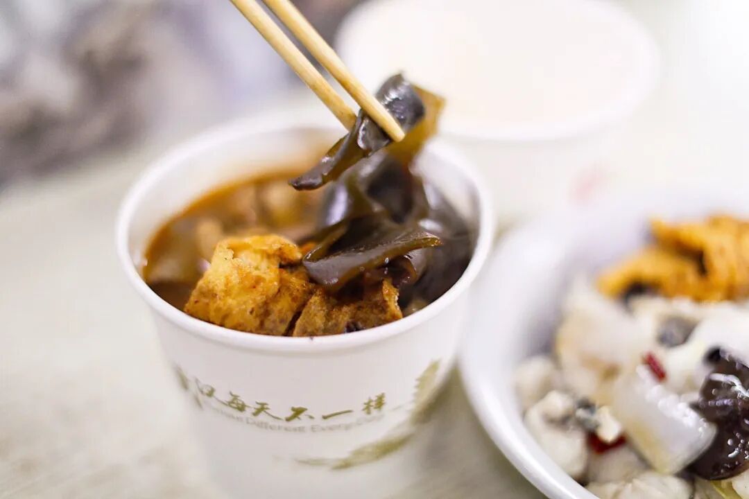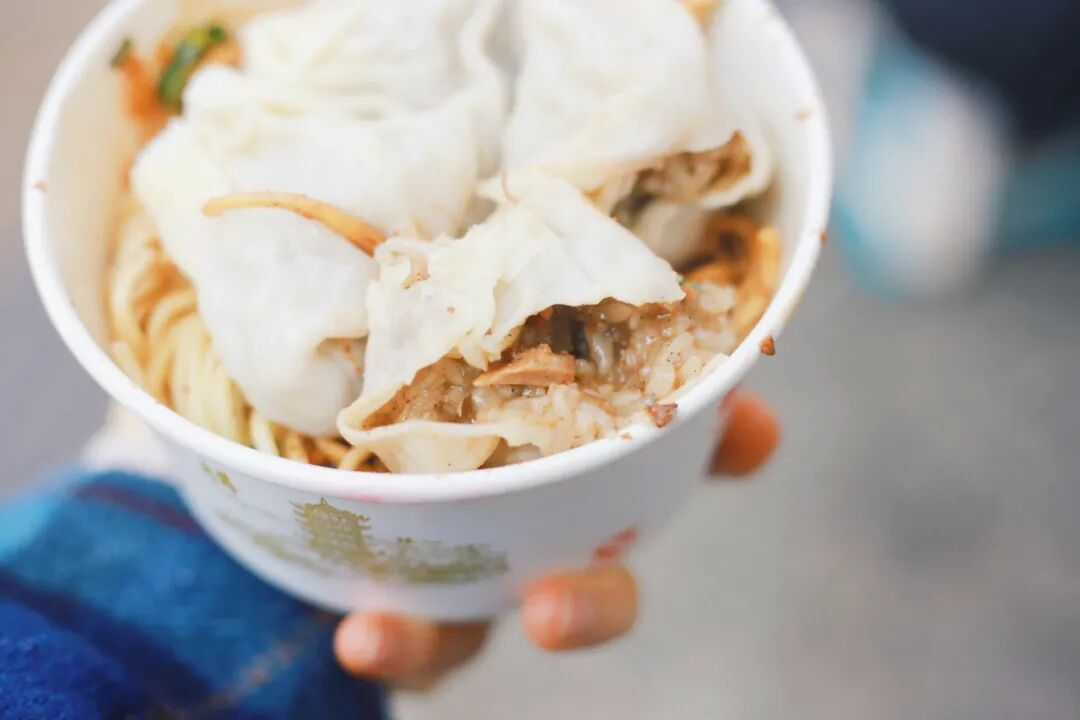 这家聋子热干面,属于武汉人常说的:“最好吃的热干面是自家楼下的那碗”!(和隔壁保持着相爱相杀的和谐状态)所在的街区真的生活气息满满,几乎整条街都是早餐,就连店门口也一溜煎炸摊位,你要先路过鸡冠饺、油饼、生煎包子才能找到粉面摊本尊。这家的热干面只要五块钱,点的时候,阿姨还会问你要不要加辣椒。