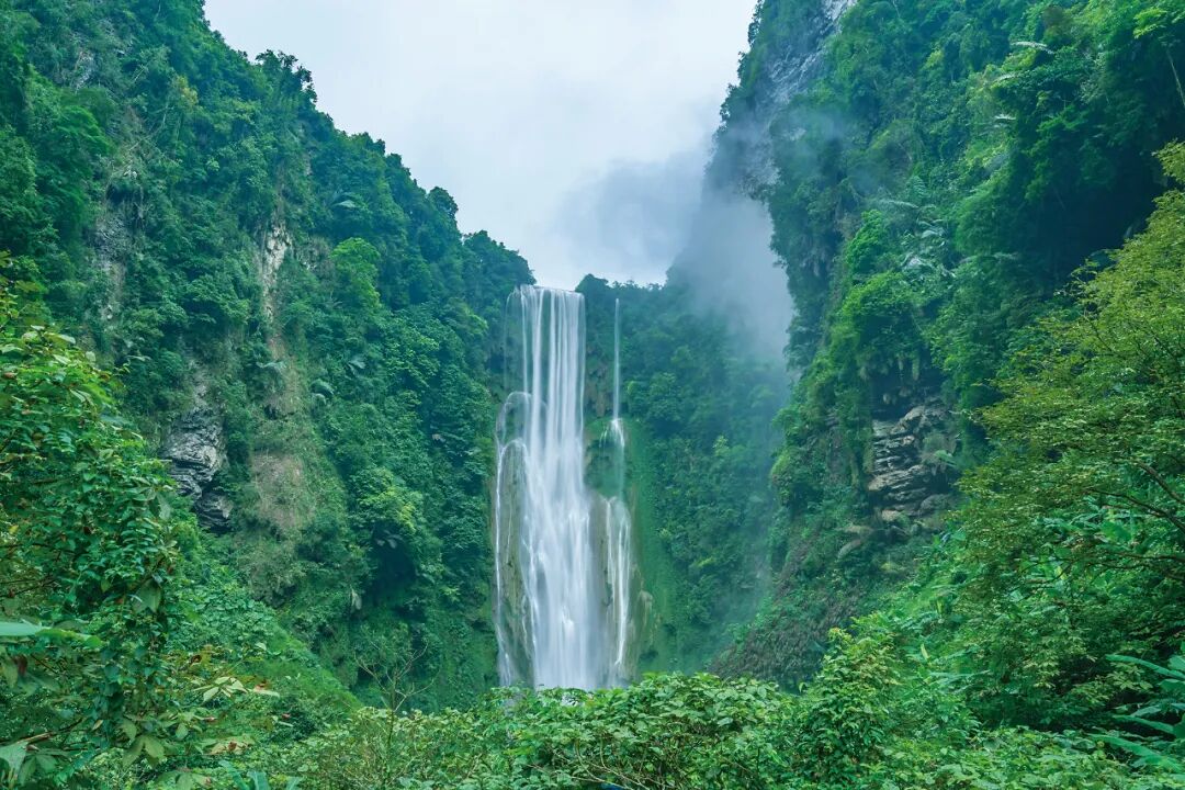 里面还有亚洲单级落差最高的瀑布——通灵大瀑布,瀑布如白练般在绿色的山间倾泻而下。