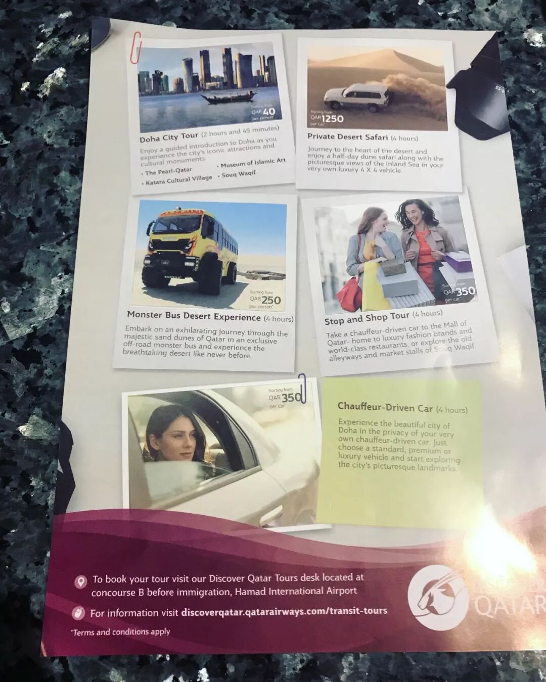 到了以后会有一张行程单发给你,让你选择项目,由于我们到达的时候已经是半夜6点多了,只能选择第一项——多哈城市游(40卡塔尔币,约等于70人民币/人)。