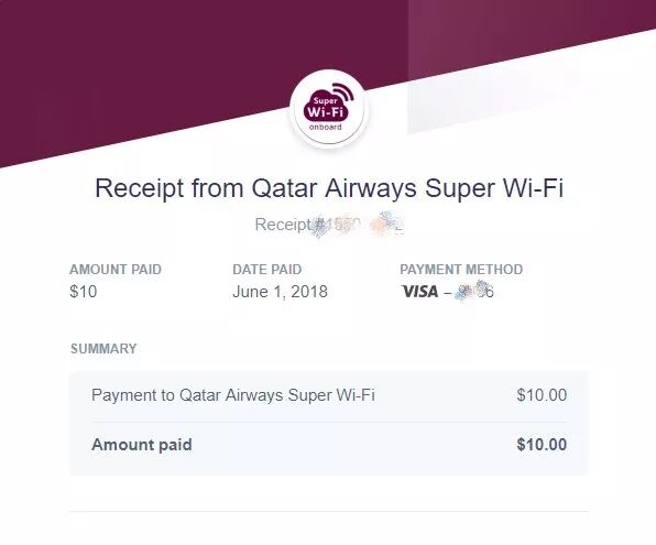 但不同的是卡塔尔航空经济舱的乘客可以免费体验1小时的Wi-Fi,使用结束后再决定是否购买。购买价格也不贵,全程只要10美元,像小飞君这种网络依赖症严重的患者,自然是会买的。上图就是会发到邮箱的收据凭证。