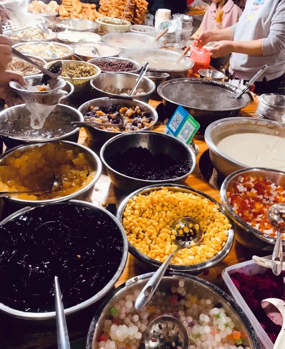 酸嘢是腌制后带有酸味的水果蔬菜,也是钦州人消暑纳凉的宝藏神器。被当地小伙伴种草了一万遍的这家张姨酸嘢摊,算是阿球的心头爱。开在学校旁,每天的销量都还不错,水果都是拿些新鲜靓货。切块的西瓜、番石榴、地菠萝加入一些秘制甘草水,再放点椒盐,就着这个mai壳晃动,拌均匀就可以开吃啦!8块一斤,买7块钱就一袋子了,买袋五彩缤纷的酸嘢,边走边吃,感觉自己就是这条gai上最靓的仔!钦州六中旁张姨酸嘢摊:钦州第六中学校门口旁边(靠近肥妈鸡粉)糖水三块钱,加水果四块,随便捞!不下二十种小料,随便捞!糖水摊都是自助,客人想吃什么加什么,装满一碗为止。但也不要加太满,给糖水留点空,不然不够甜。连吃三碗的阿球只想发出接二连三的问号和感慨,这真的是21世纪的物价吗!关键是糖水不够还可以续加糖水,简直神仙操作。