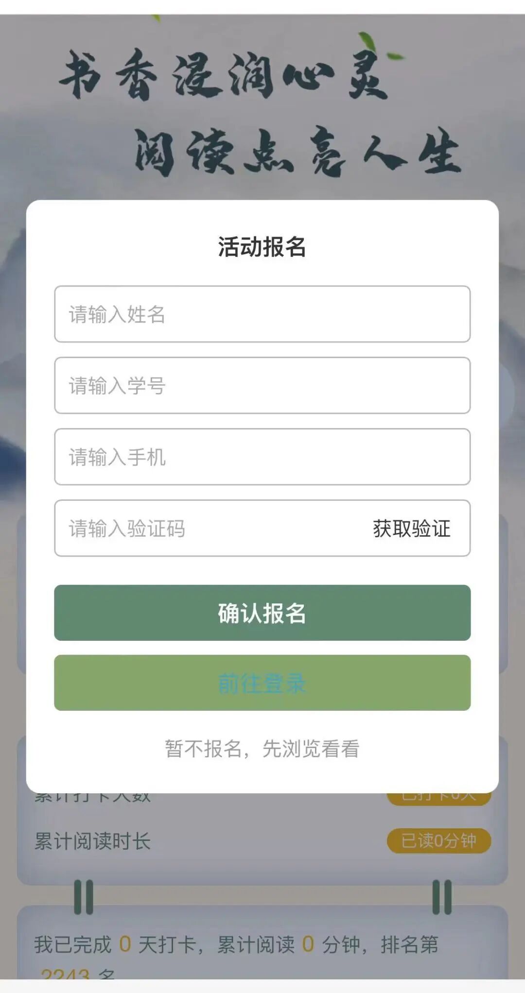 点击“图书馆”页面上方的活动图进入活动程序,输入姓名、手机号、学工号等信息确认报名。
