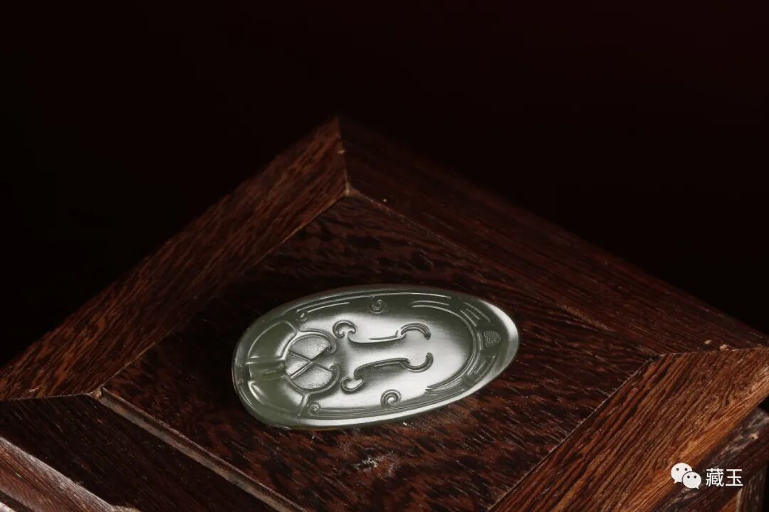 它的颜色十分浓郁,接近黑青的颜色,但玉质却比黑青更扎实,打灯细看还带点绿色的感觉,而且,在晃动时,会发现它的光感也非常强烈,十分有特点。