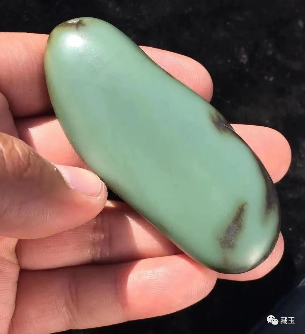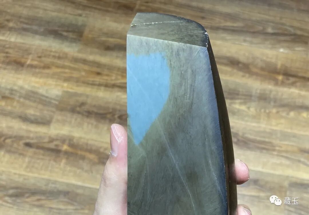 它既不像偏蓝调的沙枣青那么蓝,也不像普通青玉那样特别青,而是有一种介于青玉和碧玉之间,青绿色的感觉。