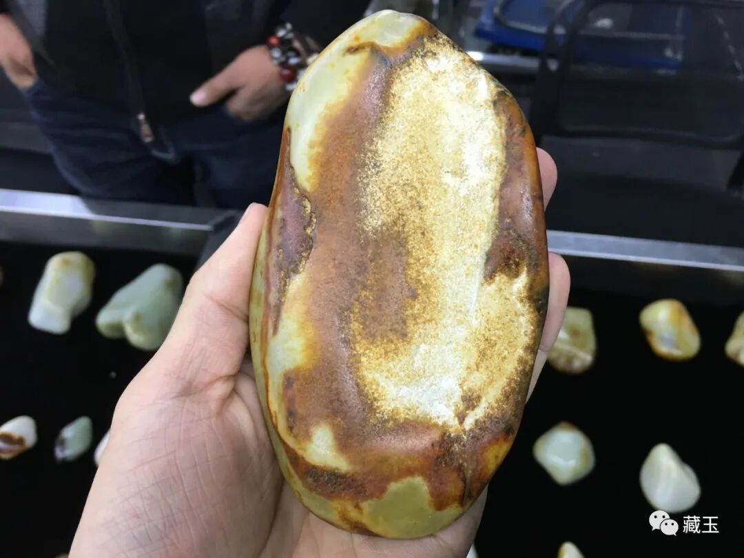 下面这个是和田巴扎上的大红皮籽料: