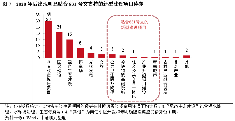 1.2020年以后,出现了资金用途明显贴合831号文“县城城镇化补短板强弱项项目”的新型建设项目债券,此为政策提振示范县发债的佐证之二