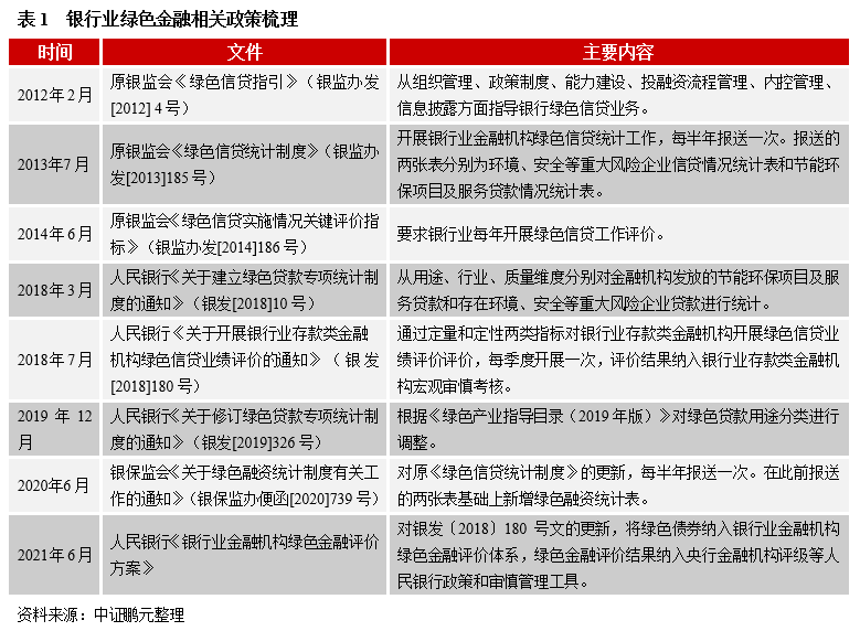 2012年原银监会发布《绿色信贷指引》指导银行绿色信贷业务以来,原银监会、人民银行相继发布了绿色信贷统计相关制度和绿色信贷业绩评价制度。2020年以来,随着国内绿色金融的繁荣发展,绿色金融取代绿色信贷,人民银行、银保监会相继更新了绿色融资统计制度和绿色金融评价方案。