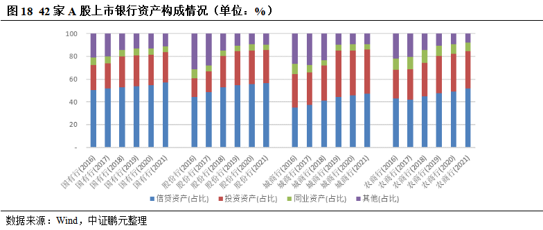 投资资产在上市银行资产配置中具有重要地位,对银行投资管理能力提出考验;大型商业银行投资风格较为稳健,股份制商业银行和城商行投资业务开展力度更大、配置更为多元