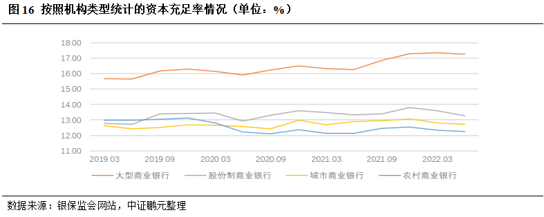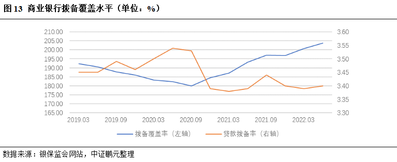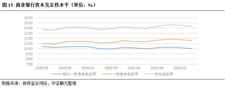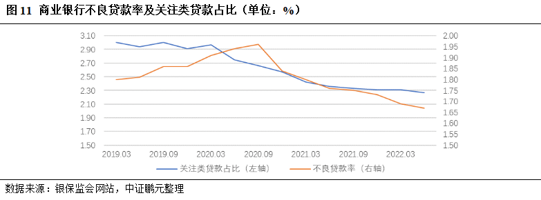 受益于不良资产处置力度加大,截至2021年末,商业银行不良贷款余额为2.85万亿元,同比增长5.39%,增速下降6.55个百分点;商业银行不良贷款率和关注类贷款占比分别较2020年末下降0.11和0.26个百分点,为1.73%和2.31%,信贷资产质量总体向好。截至2022年6月末,行业不良贷款率和关注类贷款占比分别为1.67%和2.27%,均较2021年末进一步下降。但由于国内疫情反弹,物流和供应链受到明显冲击,宏观经济增长和居民消费预期受到较大影响,商业银行信贷资产质量下行的压力依然存在。