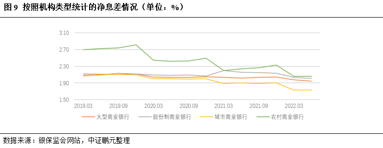 2021年监管部门出台一系列政策引导商业银行加大对实体经济的支持力度,金融机构贷款加权平均利率有较明显下降。根据中国人民银行统计,2021年12月商业银行新发放贷款加权平均利率为4.76%,同比下降27个BP。企业贷款利率下降对实体经济复苏起到了一定帮助,但同时也使得2021年商业银行净息差水平同比小幅收窄2个bp至2.08%,对商业银行营收实现形成了一定负面影响。其中,受市场利率整体下行、普惠金融进一步下沉影响,农商行面临的同业竞争压力加大,净息差较2020年显著收窄16个bp至2.33%,仍高于其他类型银行;大型商业银行净息差基本保持平稳,股份制银行受益于零售贷款转型净息差提高6个bp至2.13%,城商行净息差在2020年基础上进一步下降至1.91%。2022年以来,贷款利率下降对商业银行息差水平的负面影响更加明显,2022年二季度行业净息差为1.94%,较2021年四季度下降14个bp。2022年3季度以来,大型商业银行和股份制商业银行相继下调存款利率,商业银行息差水平或得到一定支撑。