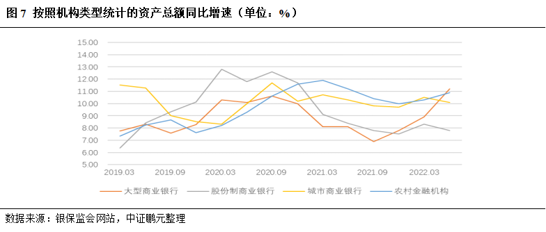 商业银行资产规模在经历了2020年的较快增长后,2021年进入了平稳增长期。截至2021年末,我国商业银行资产总额288.59万亿元,同比增长8.60%,增速较2020年下降2.50个百分点。股份制商业银行资产规模同比增速7.50%,较上年下降4.2个百分点,降幅最大。截至2022年上半年,商业银行资产总额同比增长10.40%,增速有所反弹回升。