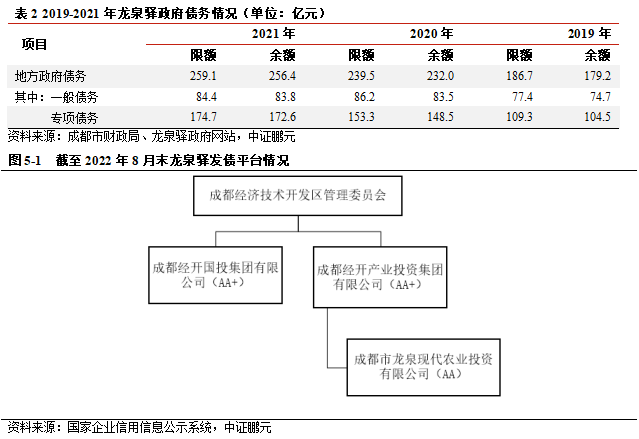 城投债务方面,2022年8月末,龙泉驿区发债城投公司共3家,其中经开国投和经开产投均为成都经济技术开发区管理委员会绝对控股的区一级平台,成都市龙泉现代农业投资有限公司(以下简称“现代农投”)为经开产投控股的一级子公司。2021年末龙泉驿发债平台总务总额达1,319亿元,其中经开产投为债务规模最大的融资平台,2021年末总债务余额为778亿元,同比增长7%;经开国投成为2021年全区债务增量的主要载体,当年总债务增加66亿元,增速为14%。近年区域城投融资主要用于存量债务还本付息以及市政基建、生态移民项目(主要由现代农投负责)、安居工程、大运会配套设施、汽车工业园、中德智能网联汽车试验场等项目建设。