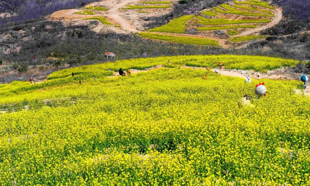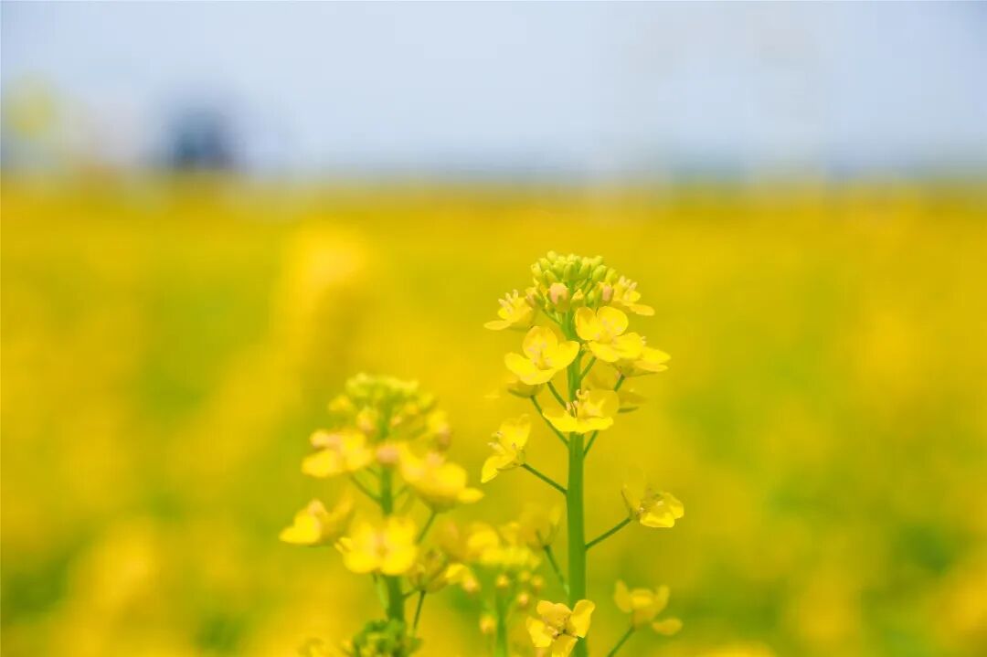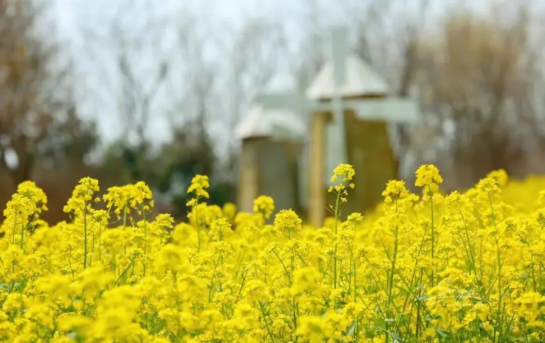 微风吹拂下,嫩黄的花朵跟着摇曳,飘动的金黄色花海就像流淌的春天。这片花海像是太阳洒落在人间的种子,暖了人心,醉了春色。