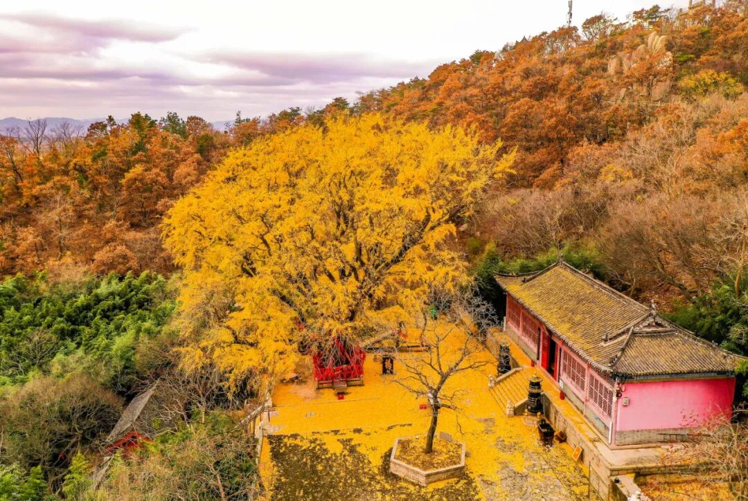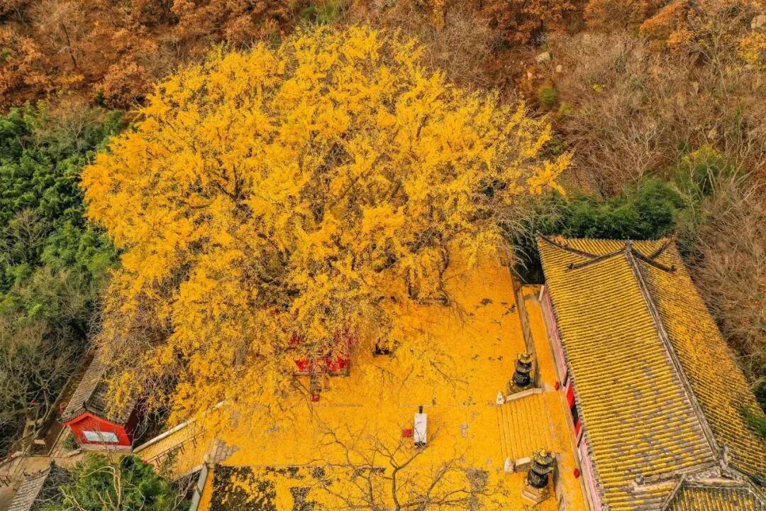 千年古银杏树雌雄同体,茂盛的叶子遮天蔽日,秋日站在树下仰望苍穹,天地间只剩一片金黄,蔚为壮观。