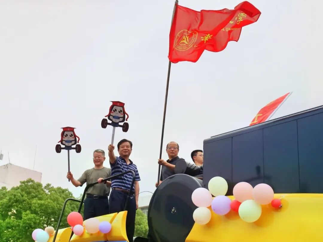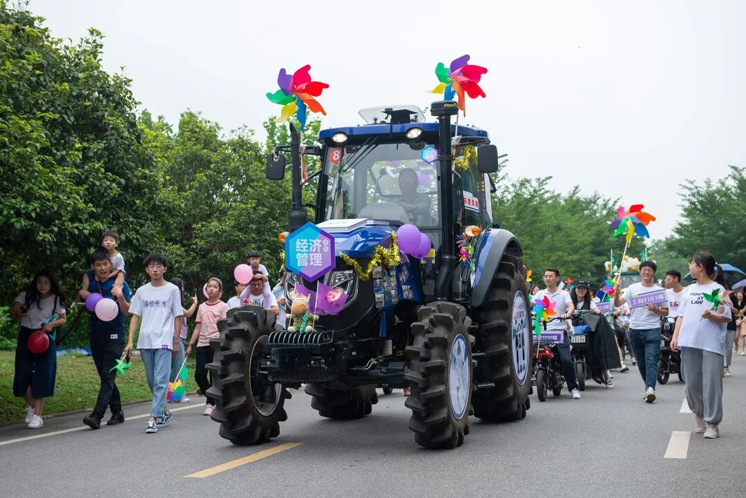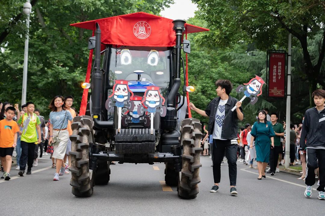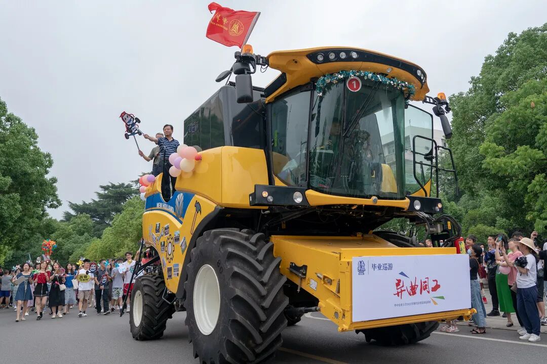 作为“排头兵”,工学院毕业生们伴随歌声踏着轻快的舞步出发,纽荷兰CX6.80联合收割机“大黄蜂”紧随其后,机车上,校长李召虎挥舞着校旗,不时与巡游的师生们热情互动。偌大的机身上,张贴了象征工业发展的锤子、扳手、螺母等图案,寓意华农学子不断发扬大国工匠精神,心系天下、勇于挑战,在科技创新领域中建功立业。