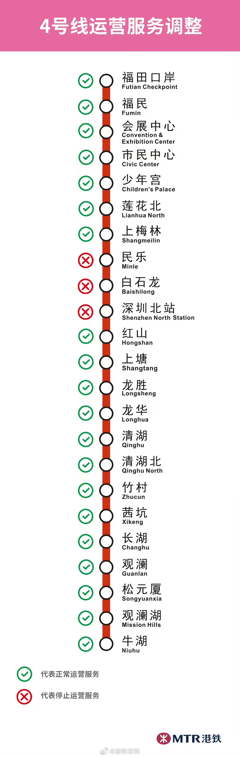 港铁深圳发布运营公告:根据新冠疫情防控需要,2022年11月30日即时起,地铁4号线深圳北站、白石龙站、民乐站暂停运营服务,双方向列车不停站通过,具体恢复时间待另行通知。