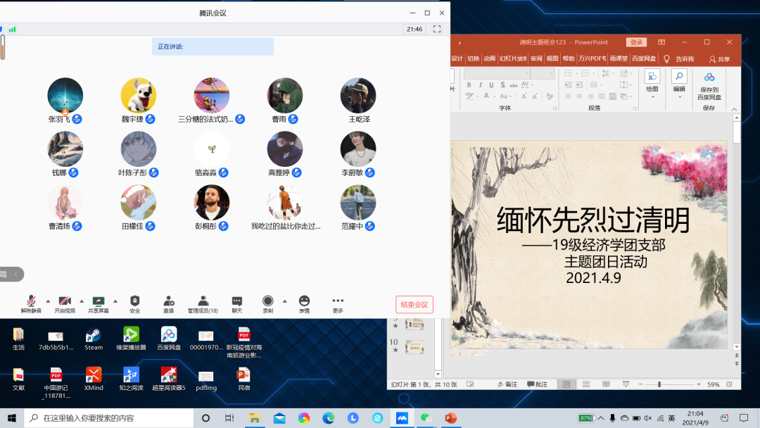 2021年4月9日,2019级经济学团支部组织了“清明遥思,缅怀先烈”4月主题团日活动,活动地点依托线上腾讯会议平台展开。首先,同学们阅读了烈士们的相关事迹,之后观看了纪录片视频在团支书的主持下,同学们对革命先烈的英雄事迹进行了认真的回顾和学习,写下了自己的感悟,之后做了广泛的交流与讨论。在此过程中,同学们对其中蕴含的大无畏的革命精神与深厚的爱国主义精神有了更进一步的理解与体会。